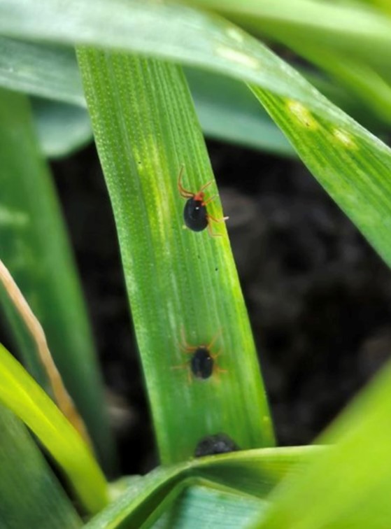 Зимний зерновой клещ — это мелкий вредитель, тело овальное до 1 мм длины темно — зеленое или почти черное, с красными ногами, с красным пятном на задней части тела. Клещ повреждает пшеницу, рожь, ячмень, злаковые травы.